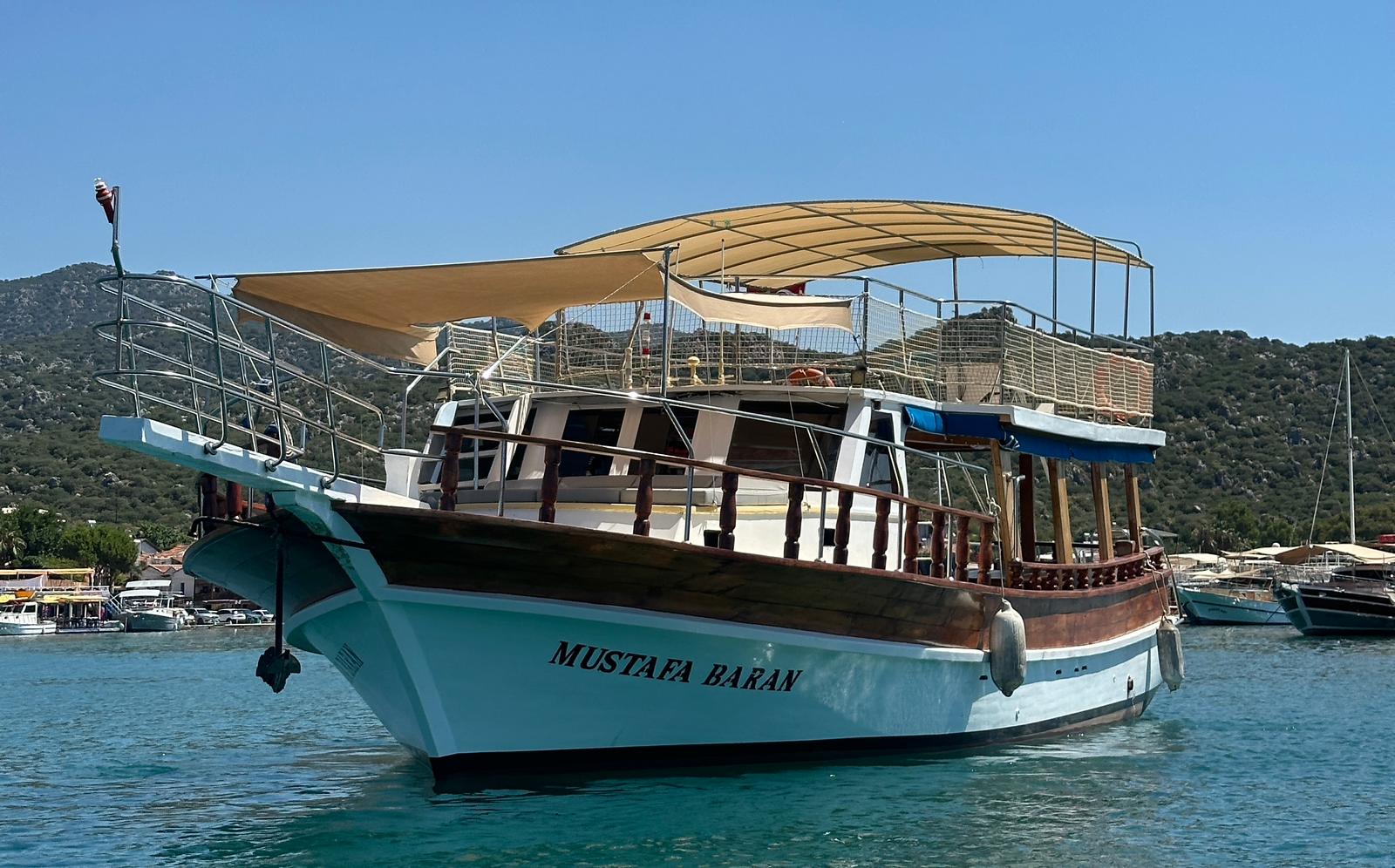 36 kişilik kapasitesiyle Mustafa Baran, kalabalık arkadaş grupları, şirket organizasyonları ve paylaşımlı turlar için mükemmeldir. Geniş güvertesi, rahat oturma alanları ve profesyonel ekibiyle Kekova’da konforlu ve keyifli bir tur deneyimi sunar.